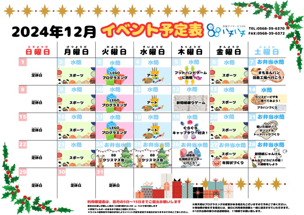 2024年12月1日 / 最終更新日時 : 2026年4月28日 88style Komaki 2024年12月 イベント予定表【88】 2024年12月のイベント予定表です。 コメントを残すメールアドレスが公開されることはありません。 ※ が付いている欄は必須項目ですコメント ※ 名前 ※ メール ※ サイト 上に表示された文字を入力してください。