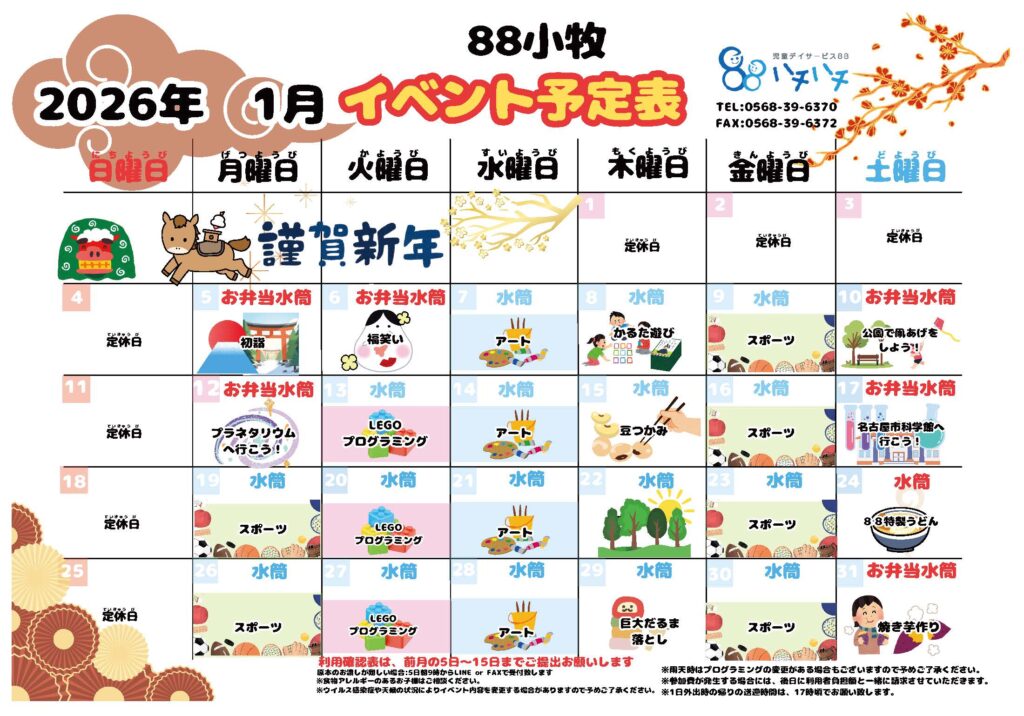 2026年1月5日 / 最終更新日時 : 2026年4月28日 88style Komaki 2026年1月 イベント予定表【88】 2026年1月のイベント予定表です。 コメントを残すメールアドレスが公開されることはありません。 ※ が付いている欄は必須項目ですコメント ※ 名前 ※ メール ※ サイト 上に表示された文字を入力してください。